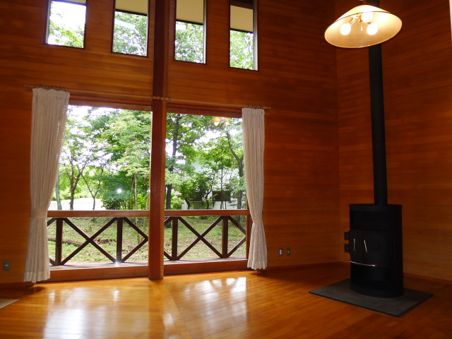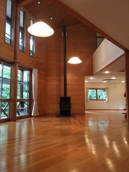 建物は木造のおしゃれな外観で、リビングには薪ストーブがあり、開放感のある吹き抜けも魅力!